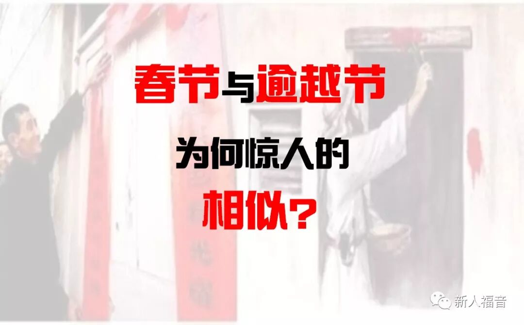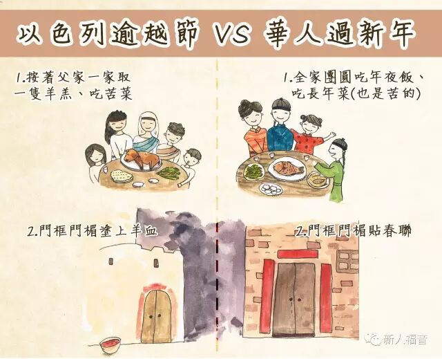 1、春节在门框和门楣上贴红色的春联,逾越节在门框和门楣上涂上羊羔的鲜血。
