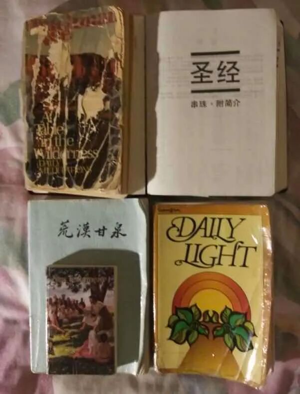 在南阳路聚会所,妈妈接触到许多属灵书籍,包括《盖恩夫人传记》、小特瑞莎的《爱是最短路程》、《荒漠甘泉》和《十二篮》等。妈妈特别喜欢读《荒漠甘泉》,在以后的几十年间,妈妈常常早晚两次读《圣经》、《荒漠甘泉》、《圣光日引》、倪弟兄的《旷野中的筵席》等。我们小时候就受妈妈的影响,也爱读这些书,妈妈还买了许多其他属灵书刊送给我们。在我们整理妈妈遗物时,就发现多本袖珍版的《圣经》及《荒漠甘泉》。她无论去哪里都会带上这两本书,哪怕是住在医院或疗养院里,因为这些都是她不可或缺的属灵食粮。注1: 开西大会(Keswick Convention)始于1875年,是一年一度在英格兰坎布里亚郡开西克(Keswick, Cumbria) 举行的福音派基督徒盛会。