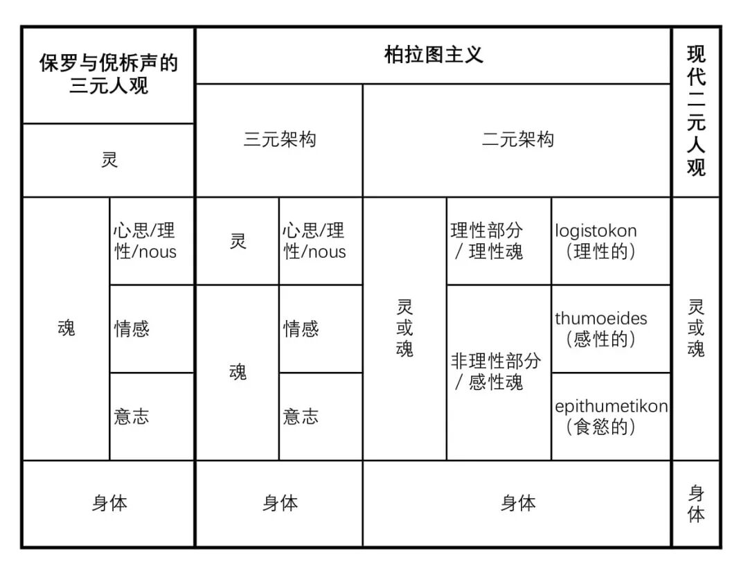 柏拉图主义三元人观中的“灵”事实上就是“心思(nous)”——三元人观的“魂”的一个部分,与保罗和倪柝声使用的三元人观中的“灵”是不同的,不可等同视之。
