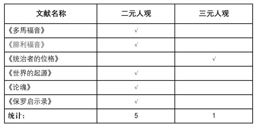 由此,我们可以看见,因为柏拉图主义的人观并没有固定的架构,仅仅将柏拉图主义与三元人观联系起来,而造成读者错误的印象是片面并错误的作法。事实上,二元人观学者对于三元人观此类的批判,也可以完全使用在二元人观上面。柏拉图主义和诺斯底主义间具有非常密切的关系,因此它们两者的人观基本上是一致的。ClarkBulter的《作为自由之故事的历史:在理性背景下的哲学》提到,早期的基督教诺斯底主义者都是区分身体和魂的柏拉图主义者。他们把人类的创造和柏拉图的二元主义结合起来。[26] Carl B. Smith 在《不再是犹太人:搜寻诺斯底的起源》中说到,柏拉图主义被融入到整个的诺斯底体系中,特别是在其神学、宇宙论和人观中。[27]由此可见,诺斯底主义在许多方面就是柏拉图主义的延续,包括其人观。1945年在上埃及发现的拿戈玛第经集(NagHammadi library)是目前发现的最为丰富的诺斯底文献。而 James M. Robinson 编辑的《拿戈玛第经集英译》则是目前英语世界最为权威的英文译本,也是许多学者用来研究诺斯底主义的必备参考书书。本文即以此经集作为一次文献的来源。《多马福音》论到,耶稣论到人有身体和魂。[28]根据《腓利福音》,亚当的魂乃是借着(耶和华向他吹的)气息而存在。魂的伙伴是灵,并且会被灵所取代。[29]《统治者的位格》告诉我们,仅仅有属于低层次的魂不可能拥有从上而来灵,当他向人的脸吹气的时候,人就拥有魂。灵借着从亚当的地而来,降下并住在有魂的人里面,让那个人成为活的魂。[30]《世界的起源》指出,诺斯底主义认为有七个掌权者(rulers)根据它们的身体创造了人的身体,使得亚当成为有魂的人。[31]《论魂》一书指出,古代的智者赋予了魂一个女性的称呼,然而她落到了身体中,临及这个世界,她接着就落到了许多强盗的手里。[32]该书还进一步提及人们当保守自己的身体和魂,避免淫乱。[33]《保罗启示录》论到魂在身体中无法无天的行事。[34] ![]()