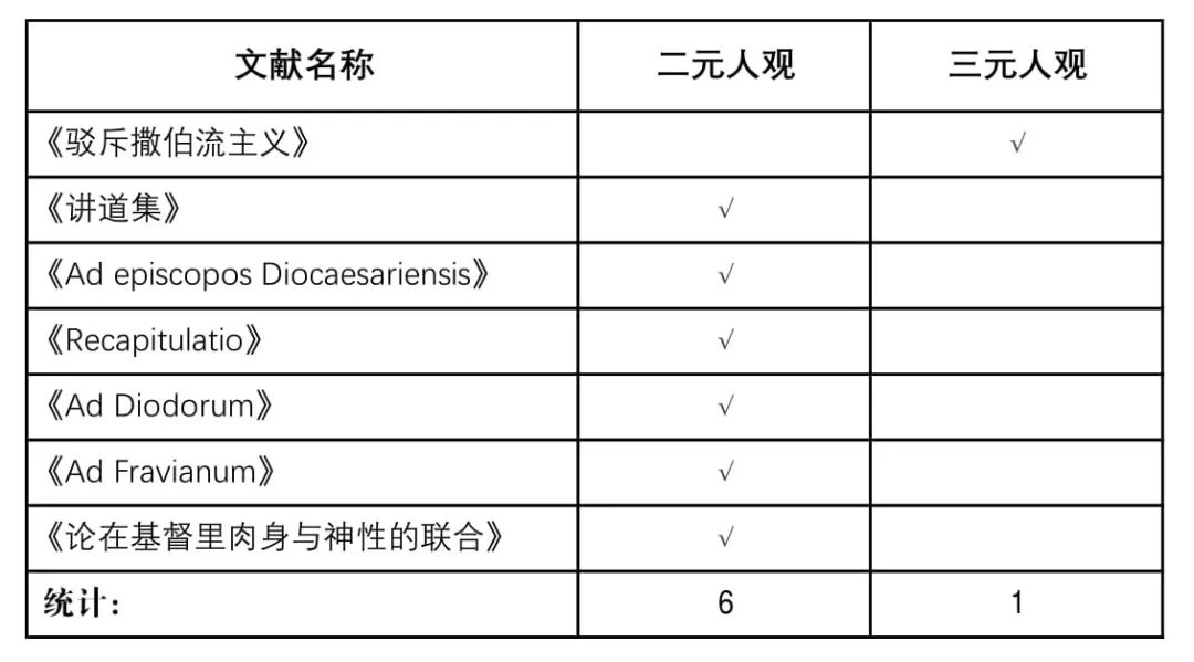 除了,英文《拿戈玛第经集》的译者在该书第190页使用二元人观架构来讨论《论魂》那篇文章;译者在对《西瓦奴的教义》的评论中,则说到这本智慧文学以令人惊讶的方式与圣经,后期的犹太人思想,中柏拉图主义和后期的斯多亚主义的人观,道德和神学观念呼应。而作者同时使用了类似于诺斯底主义的三元人观(心思、魂、身体)的观点。[35]不论是《拿戈玛第经集英译》翻译的诺斯底文献本文,抑或是译者的评注,都体现出诺斯底主义本身就如同柏拉图主义一样,同时采取了二元人观和三元人观的观点。但是,根据能够获得的一次文献,诺斯底主义主义还是采取二元人观——5次采用了二元人观,1次采用了三元人观。确实有许多二次文献论及诺斯底主义与三元人观的关系。例如,Stephan AHoeller 在《诺斯底主义:对于古代内在知识传统的新亮光》一书里面指出,诺斯底主义认为人是由灵、魂和身体所构成的。[36]然而,与其相对的,我们看 Edwin M. Yamauchi 在《基督教前的诺斯底主义:对于被推荐的证据的调查》一书中则提到,保罗否认了诺斯底关于身体/灵的二元人观。[37] Perter Lallman认为《约翰行传》乃是根据魂与身体的二元人观主义。[38] 根据 Steven L. Davis 的《多马福音与基督教智慧》,多马福音中的诺斯底主义着重一种魂-身体的二元人观。[39] Gary B. Ferngren 的《早期基督教的医药与医疗照顾》一书中指出,诺斯底主义继承了希腊人的二元主义,这种观点被基督教所否定。[40] Warren S. Brown 和 Brad D. Strawn 共同撰写的《基督徒生活的物质本性:神经科学、心理学和教会》中说到,基督教因为受到奥古斯丁和笛卡尔强调的二元主义的影响,而非常强调身体和魂之间的分别,造成教会中诺斯底主义的逐渐复苏。基督徒的生活需要活在属灵的范畴中,与身体生活完全脱节。[41]根据 Everett Ferguson 编辑的《早期基督教百科全书》,魂和身体的观念由希腊哲学家提出,后由柏拉图进一步发展。到了第二和第三世纪,诺斯底的著作表明身体是由次等的神祗所创造,作为魂与心思的工具。诺斯底主义认为救赎就是脱离身体。[42]比较有趣的是 Andrew Phillip Smith。在他的《诺斯底论及魂的著作:注释与解释》中告诉我们,柏拉图主义认为心思——魂的理性部分,乃是完美和优美的白马,身体则是野蛮和顽固的黑马。二元人观的某些元素在诺斯底主义和许多基督教的形式中都可以被找到。[43]这明显的是二元人观的架构。但是在他编辑的《诺斯底主义字典》中的词条——魂中,他却说到古代诺斯底主义者认为魂乃是在三元人观的身体/魂/灵的中间部分。[44]在同一本书中的词条——二元人观中,他说到,诺斯底主义普遍采取三元人观的架构,而灵类似于神祗,而魂乃是身体和灵的中间部分。[45]他在这两处论述中,反而认为诺斯底主义使用的是三元人观的架构。这个让我们看见,即便是研究诺斯底主义一次文献的专家,对于诺斯底主义的人观的观点都是不固定的。由此可见,在二次文献的范畴中,学者们对于诺斯底主义到底是持二元人观还是三元人观仍然是众说纷纭,没有定见。由于柏拉图主义和诺斯底主义间的密切关系和承传性产生了一个很有意思的现象,就是:如同前面柏拉图的人观研究的结果,对于诺斯底人观的研究也表明,二元人观学者对于三元人观此类的批判,也可以完全使用在二元人观上面。而仅仅将柏拉图主义与三元人观建立任何联系的作法以造成读者错误的印象也是错误的。我们接下来要来到亚波里拿流主义和三元人观间的关系。本段分成一次文献和二次文献两个部分。目前在英语世界并没有整套的亚波里拿流文献的翻译。目前只有威士康辛州的路德学院(WisconsinLutheran College)在在线提供了根据德国学者 Lietzmann 德文译本的英文翻译。[46]此外,就必须从薛夫(Phillip Schaff)的古教父文集中提取相关的文献。亚波里拿流在《驳斥撒伯流主义》一书中说到他不会怀疑人是由灵、魂和身体所组成的。[47]这是唯一一次的三元人观记载。在《讲道集》中,他宣称基督乃是被神吹进气的身体,在其肉身中具有一个神圣的灵——属天的心思。[48]根据《Adepiscopos Diocaesariensis》,亚波里拿流认为道并没有取得人的理性,因此基督的身体是缺少魂/理性的。[49]根据《Recapitulatio》一文,亚波里拿流认为基督是一个由灵与肉身联合的人(spirit united to flesh is a man)。因此,祂根据不同的意义,是一个神圣的灵与肉身的联合(Therefore, He is a divine spirit united with flesh)。[50]《Ad Diodorum》这篇文章则说,人拥有魂和身体,基督的魂(具有神性)和身体仍保持其原有的性质,不混合。[51]《Ad Fravianum》则说基督乃是一个被神化的身体所包裹的神,成为一个没有身体的与有身体结合的混合物。[52]据信是亚波里拿流假尤利乌斯写的《论在基督里肉身与神性的联合(Pseudo-JuliusI: De unione corporis et divinitatis in Christo)》中指出,非受造的与被造的在基督里被混合在一起,祂被造为两个不完整的部分。整个人被称作“肉体”,里面没有魂。而整个带着身体的人被称作“魂”。[53]《De Unione》则认为,无魂(soul-less)并无理性(mind-less)并无意志(will-less)的所罗门预示了耶稣身体的殿。[54](意思是:若把所罗门的理性和意志去除,只剩下一个身体,这个身体就预示了基督的身体为神/圣灵的殿。) ![]()