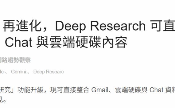 Gemini「深度研究」功能升級,現可直接整合 Gmail、雲端硬碟與 Chat 資料,以提供跨來源 […] Learning Gemini 再進化,Deep Research 可直接讀取 Gmail、Chat 與雲端硬碟內容