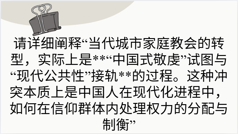 请详细阐释“当代城市家庭教会的转型,实际上是**“中国式敬虔”试图与“现代公共性”接轨**的过程。这种冲突本质上是中国人在现代化进程中,如何在信仰群体内处理权力的分配与制衡”