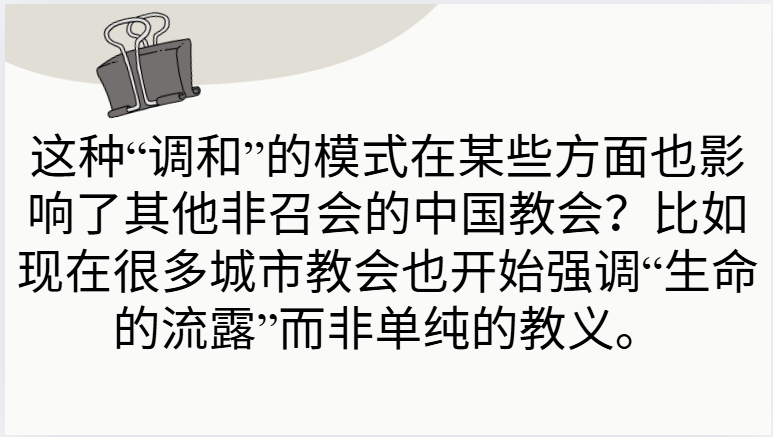 这种“调和”的模式在某些方面也影响了其他非召会的中国教会?比如现在很多城市教会也开始强调“生命的流露”而非单纯的教义。