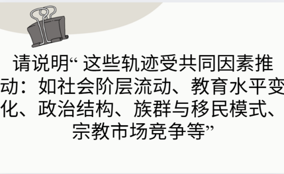 这些因素可以理解为:宗教团体在从“分裂的小宗派”走向“稳定的教派”的过程中,所处的社会环境在不断“塑 […] Learning 请说明“ 这些轨迹受共同因素推动:如社会阶层流动、教育水平变化、政治结构、族群与移民模式、宗教市场竞争等”