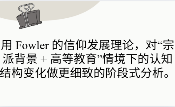 在“宗派背景 + 高等教育”的情境中,可以把 Fowler 的信仰发展阶段,读作一种对宗派性信仰从“ […] Learning 用 Fowler 的信仰发展理论,对“宗派背景 + 高等教育”情境下的认知结构变化做更细致的阶段式分析。