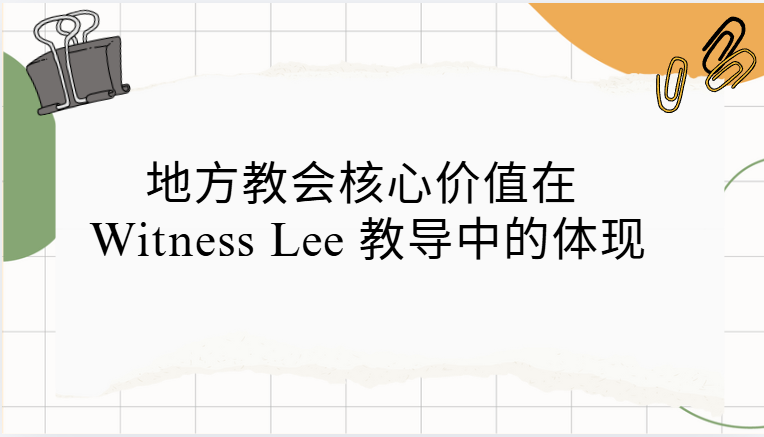 在 Witness Lee 的教导里,“地方教会”的核心价值不是一套组织制度,而是一条围绕神永远经纶、基督身体与地方实行的属灵“主线”,可以概括为:以真理作根基、以生命为内容、以召会为彰显、以福音为外展,并且在每一城实际活出普世基督身体的一。[1][2][3]