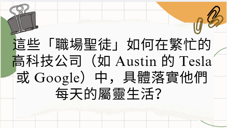 在奧斯汀(Austin)被譽為「矽丘」(Silicon Hills)的背景下,許多來自 UT Austin 的畢業生進入了 Tesla、Google、Apple 或 Oracle 等高科技公司。面對高強度的工作壓力與碎片化的時間,他們落實屬靈生活的核心在於**「神聖生命與職業生活的無縫整合」**,而非將兩者切開。