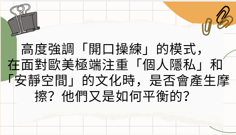 在亞洲背景下,集體主義較強,長輩叫你開口你通常會配合;但在美國,強迫感會導致新人立即逃離(Flight response)。