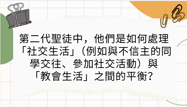 第二代聖徒不是在社交生活與教會生活之間畫一條死板的線,而是學會將**「教會生活的動力」帶進「社交生活的現場」**。他們不是被動地被世界同化,而是主動地在社交中尋找可以被帶回「家」的人。
