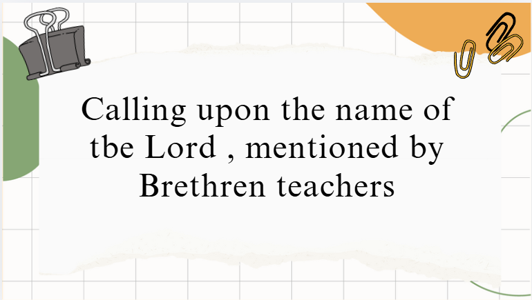 – Brethren writers often note that 1 Corinthians 1:2 describes believers as those who “call upon the name of the Lord Jesus Christ in every place,” and use this to argue that genuine Christians, wherever they meet, are gathered around Christ’s Name alone. “Calling on the name of the Lord Jesus, professing salvation through His [work]” is used as a concise description of their ecclesial identity: people gathered simply to Christ, apart from denominational titles.[7][8][9]