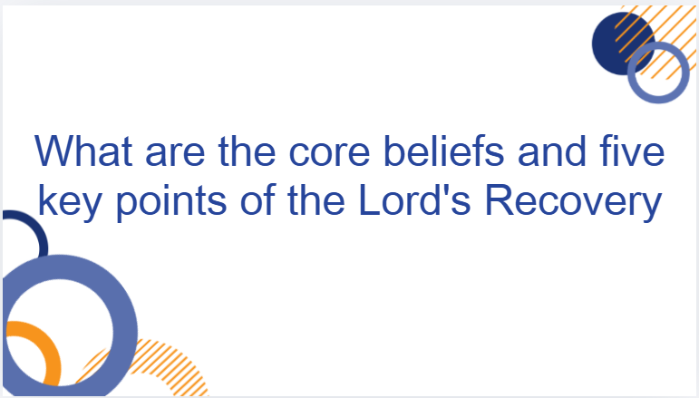 In Witness Lee’s presentation, the “Lord’s Recovery” is not a new denomination but God’s move to recover key biblical truths and practices centered on Christ as life, the Spirit, the church as the Body, and the kingdom, for the building up of the Body of Christ.[1][2]