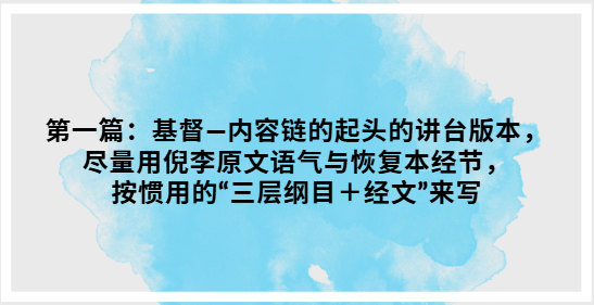 下面是“第一篇:基督——内容链的起头”的讲台版本,尽量用倪李原文语气与恢复本经节,按你惯用的“三层纲目+经文”来写;你可再按需要裁剪字数与补足更多原句。[1][2][3][4][5][6][7]