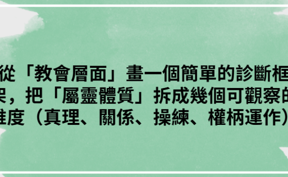可以把「教會的屬靈體質」轉化為一個四維度診斷框架:真理、關係、操練、權柄運作,每一維都用少量、可觀察 […]