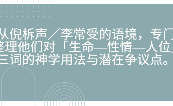 先给一个大框架:倪柝声较多在「人论/灵魂体」「两个生命、两个性情」中使用生命与性情的区分;李常受则在 […]