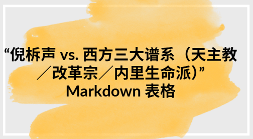 | 栏目 | 倪柝声 | 天主教 | 改革宗 | 内里生命派(Keswick/更生派等) |