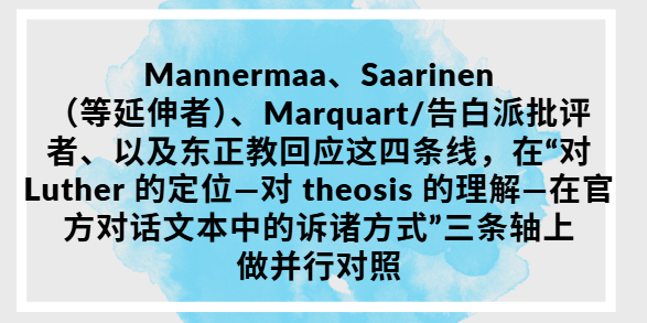 | 维度 | Mannermaa 线 | Saarinen 等延伸者 | Marquart / 告白派批评者 | 东正教侧回应(整体趋势) |