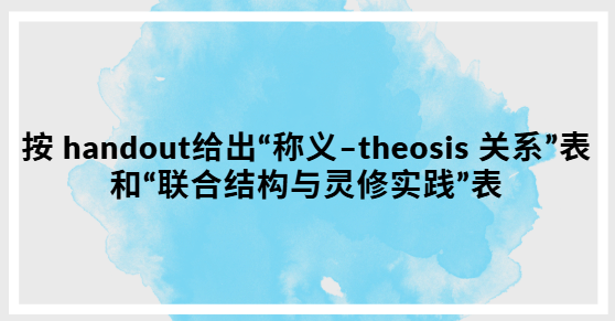 先给“称义–theosis 关系”表,再给“联合结构与灵修实践”表,都按 handout 密度整理。