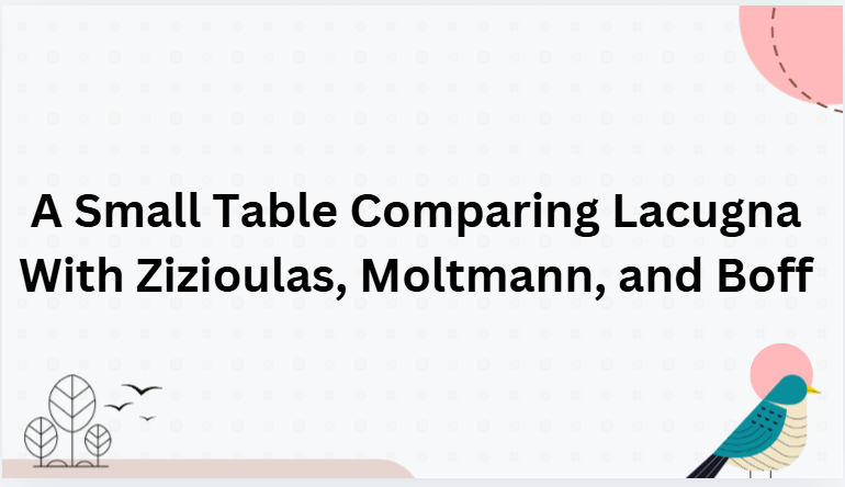 | **John Zizioulas** | Begins from Eucharistic and episcopal experience of the church: Trinity known through **liturgical/sacramental economy** where the Spirit gathers many into the one Body of Christ under the Father. Economy reveals ontology but also safeguards divine freedom. [6][7] | Famous for “being as communion”: the person (hypostasis) is constituted by relation; the **monarchy of the Father** is source, but being itself is communion of Father, Son, Spirit. Human personhood arises in ecclesial communion as an image of this. [7][6] | Strongly ecclesial: the church, gathered in the Eucharist around the bishop, images the Trinity; emphasizes communal identity over individualism and critiques Western personalism. Less directly political than LaCugna or Boff, but still anti‑individualist and communion‑focused. [7][6] |