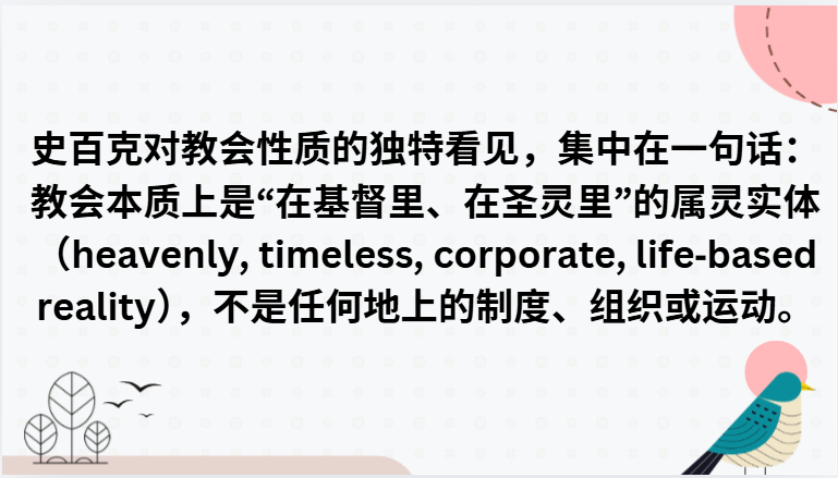 史百克对教会性质的独特看见,集中在一句话:教会本质上是“在基督里、在圣灵里”的属灵实体(heavenly, timeless, corporate, life‑based reality),不是任何地上的制度、组织或运动。[1][2] ## 1. 教会是“属灵+属天+永恒”的实体 – 他强调“教会在神心意中”乃是一个在属灵领域真实存在的团体,不可简单等同于地上任何可见教会状态,否则会陷入沮丧或妥协。[1] – 在讲解以弗所书、歌罗西书时,他用“timelessness(无时间性)”形容教会:神在创世以前已拣选并预定教会,这个团体在神那里是超越时间、扎根于永恒的真实。[1] ## 2. 教会是“在属灵争战中间站立的团体见证” – 他提出一个颇有特色的结构:个人重建(个人被基督更新)——中间是教会作“团体见证”——外圈是宇宙属灵权势;真正触及外圈黑暗权势的是教会这个团体,而非孤立个体。