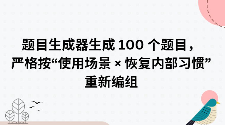 好。下面我把刚才那 100 个题目,严格按“使用场景 × 恢复内部习惯”重新编组,让你一拿就能用、不必再判断。