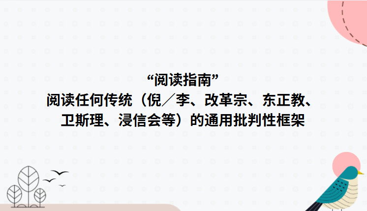 下面这份“阅读指南”是给高年级学生用的,你可以直接放进 syllabus 或讲义里,当作阅读任何传统(倪/李、改革宗、东正教、卫斯理、