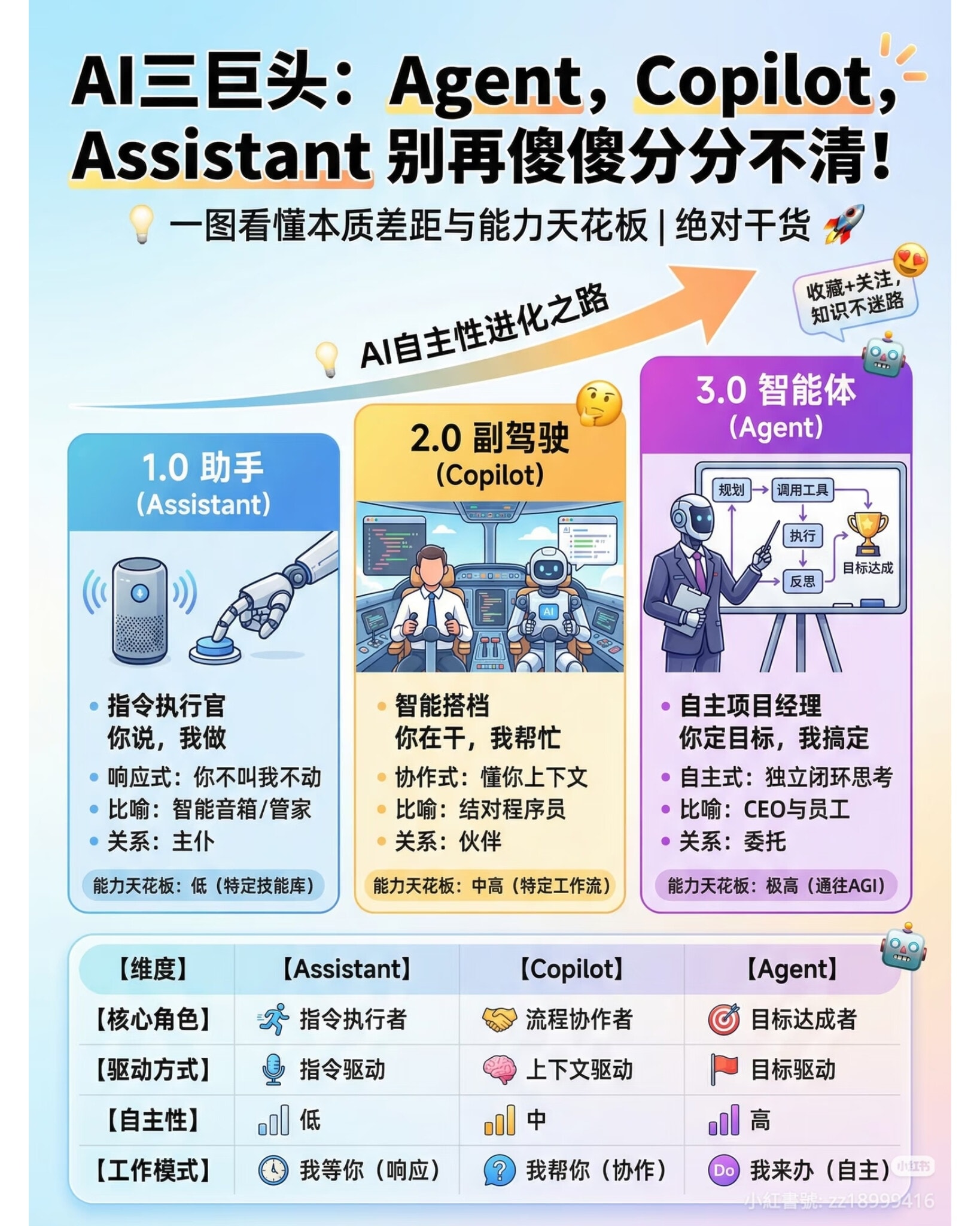 Learning Assistant, Copilot, Agent之差異說明 来自 Bethany|已发表 2026-02-23 Assistant, Copilot, Agent之差異說明。From: 模探AI智能體官方http://xhslink.com/o/AyURXIVyGdQ