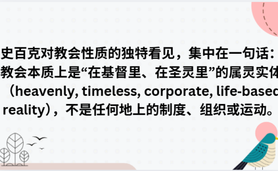 史百克对教会性质的独特看见,集中在一句话:教会本质上是“在基督里、在圣灵里”的属灵实体(heaven […]
