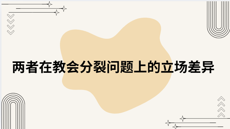 在“教会分裂”上,两人的共同点是都视分裂为严重问题,但他们认定“什么才是分裂、何时必须分离、怎样的分离仍算在合一之内”有明显不同的标尺和实践路向。[1][2][3][4][5][6][7][8]
