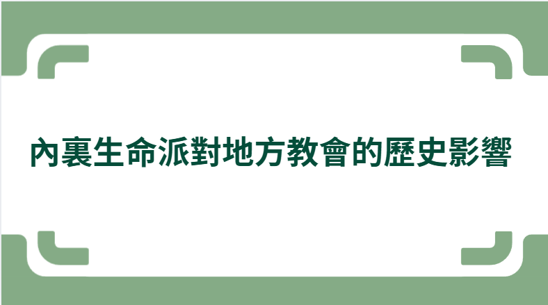 內裏生命派對地方教會的歷史影響既深且廣,可從人物傳承、神學吸收與選擇性批判三個層次來梳理。