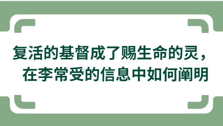 在 李常受 的信息中,“复活的基督成了赐生命的灵”并不是一句抽象口号,而是他整套神经纶—生命构成—信徒经历神学的一个枢纽性命题。下面我按他一贯的阐明路径,为你系统梳理。
