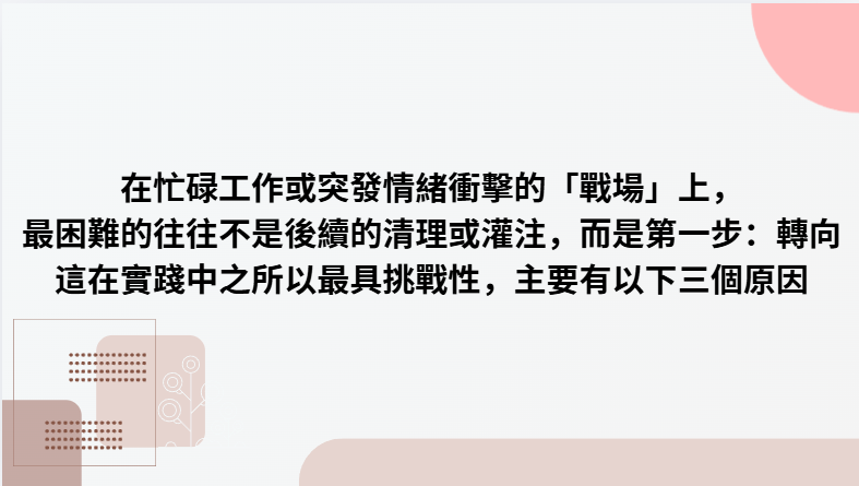 * 挑戰: 轉向靈需要一絲微小的「空間」。但在連環會議或訊息轟炸中,