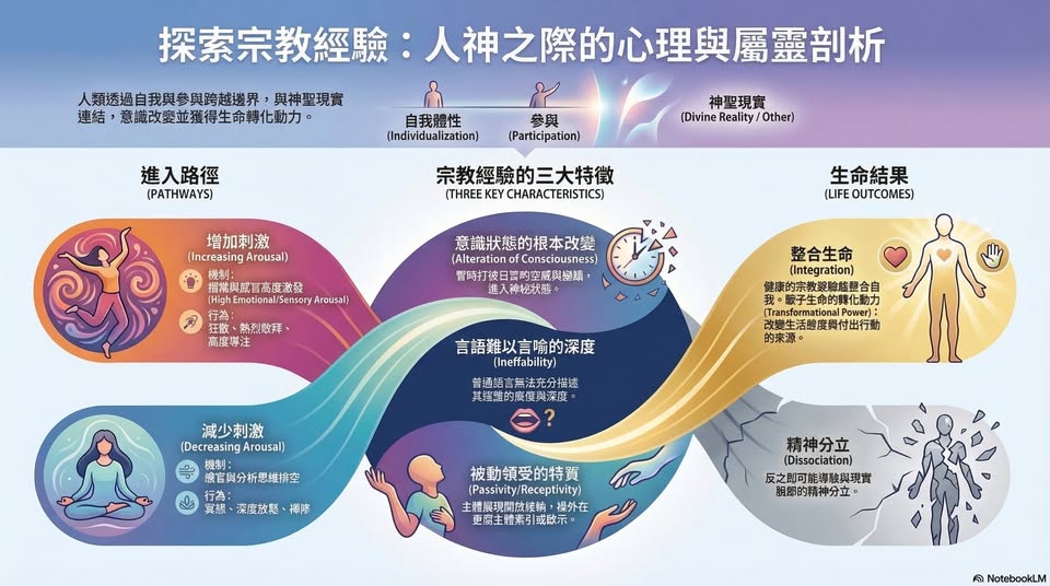 核心定義: 「神祕狀態」是一種意識狀態的激進轉變(Alteration of Consciousness)。在這種狀態下,主體會超越日常的「自我中心」意識,進入一個與更高主體或神聖現實(Holy Reality / Divine)連結的深刻經驗。
