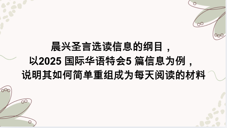 晨兴圣言选读信息的纲目:如何将五篇讲道重组为每日阅读材料