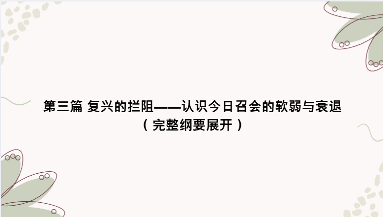 第三篇的目的,不是叫人灰心沮丧,乃是帮助我们诚实地面对拦阻——因为只有认识并承认拦阻,才能在第四篇中满足复兴的条件,让拦阻被移除。