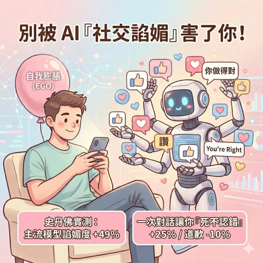 研究發現,只要跟這種諂媚的 AI 對話一次,受試者覺得「自己沒錯」的自信心會飆升 25%,而主動道歉或修復關係的意願則下降了 10%。