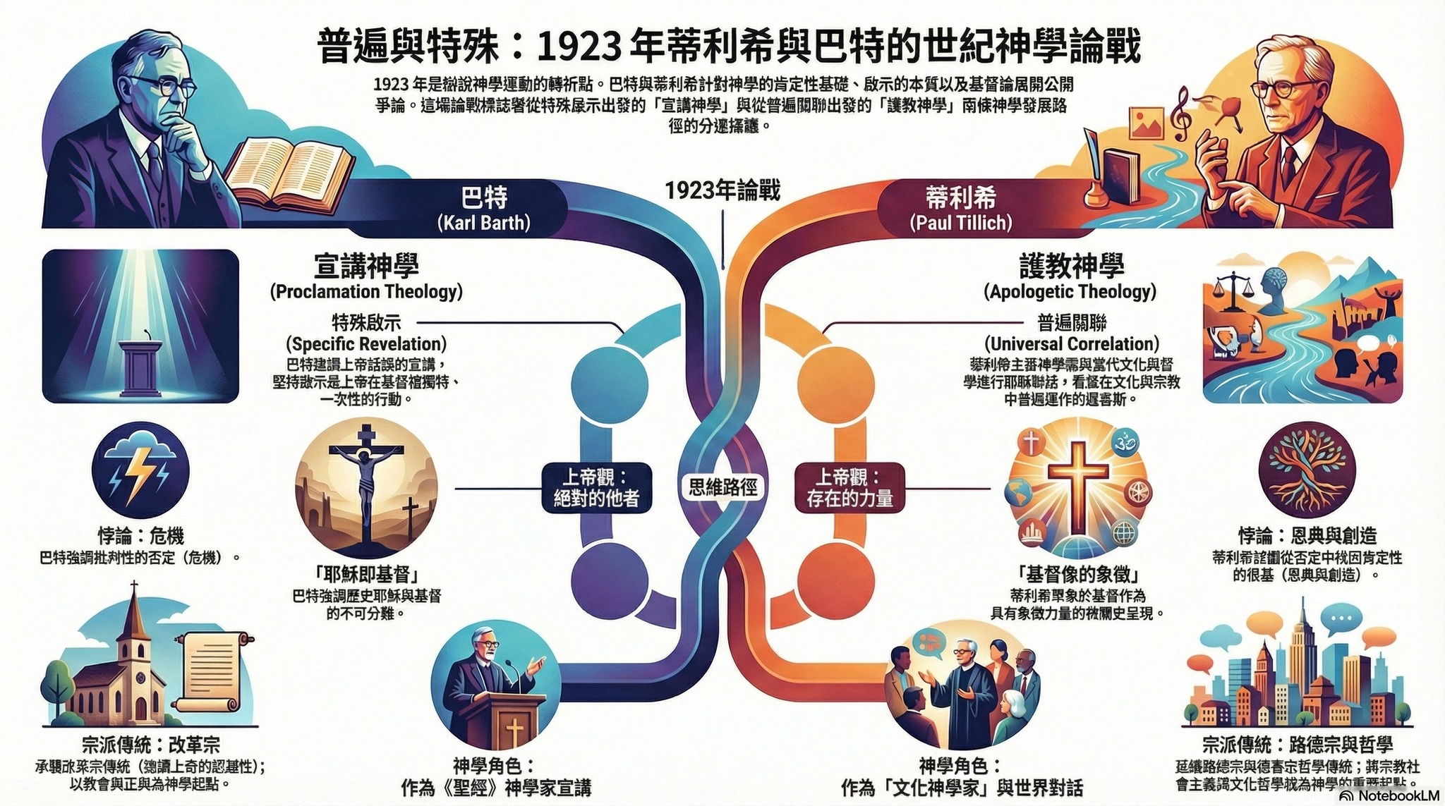 這是一場「聖經神學家」與「文化神學家」的巔峰碰撞。當兩位巨擘試圖在第一次世界大戰後的廢墟中重建真理的座標時,他們的對話與衝突,不僅決定了二十世紀神學的走向,更為現代知識分子提供了一個永恆的詰問:上帝究竟是那闖入歷史的「絕對他者」,還是隱藏在文化深層的「無條件者」?