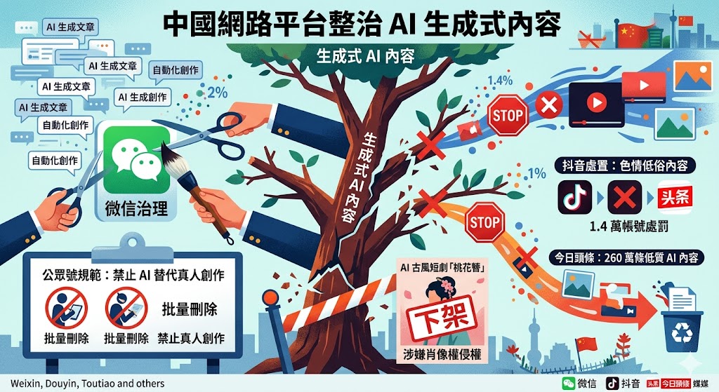 因應生成式 AI 內容亂象,中國網路平台出手整治。微信明令禁止以 AI 替代真人創作並刪除文章;抖音、今日頭條等亦已處置數百萬則低品質或侵權內容,遏止違規行為。